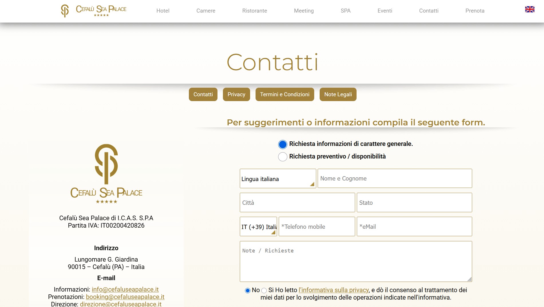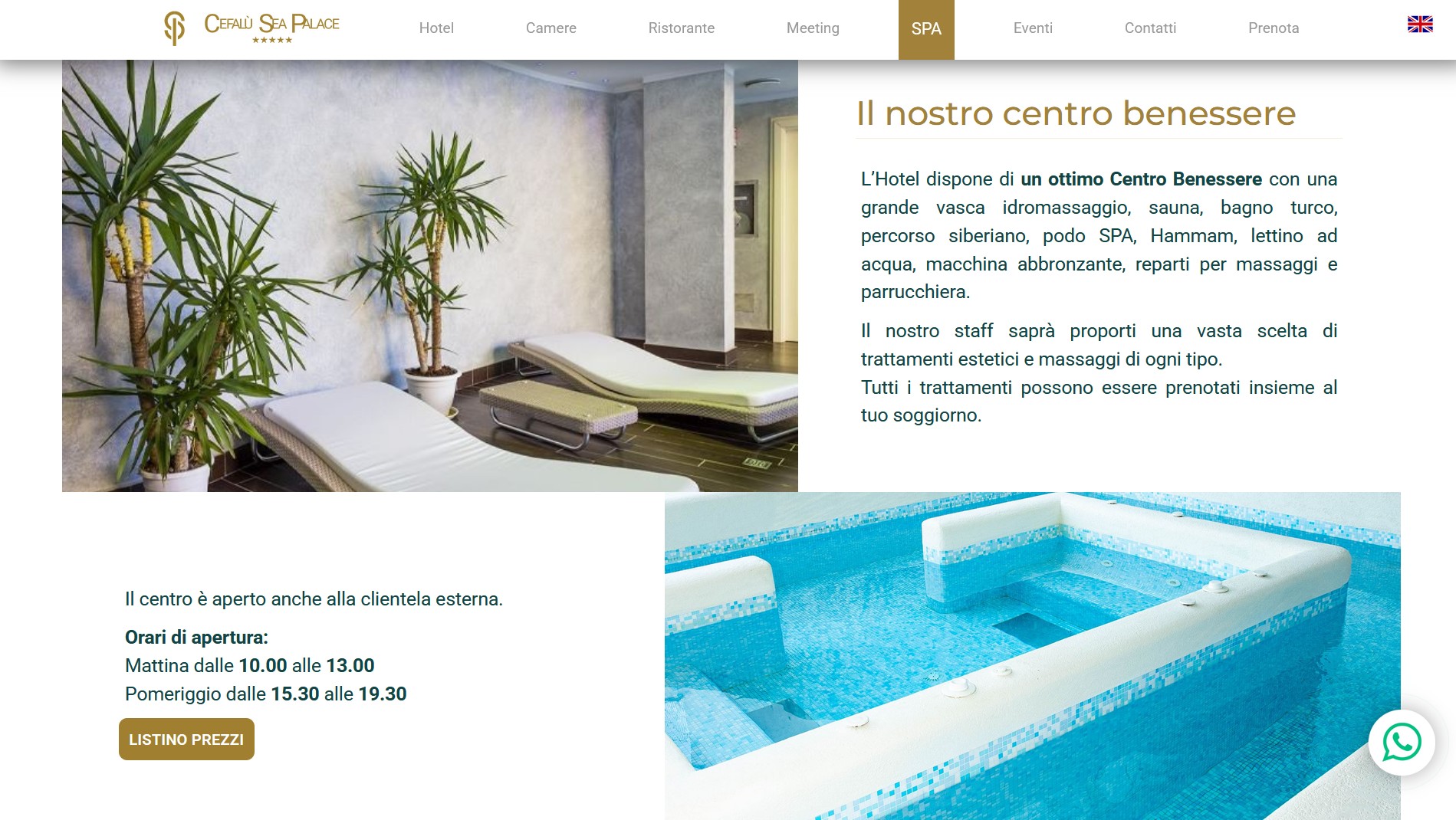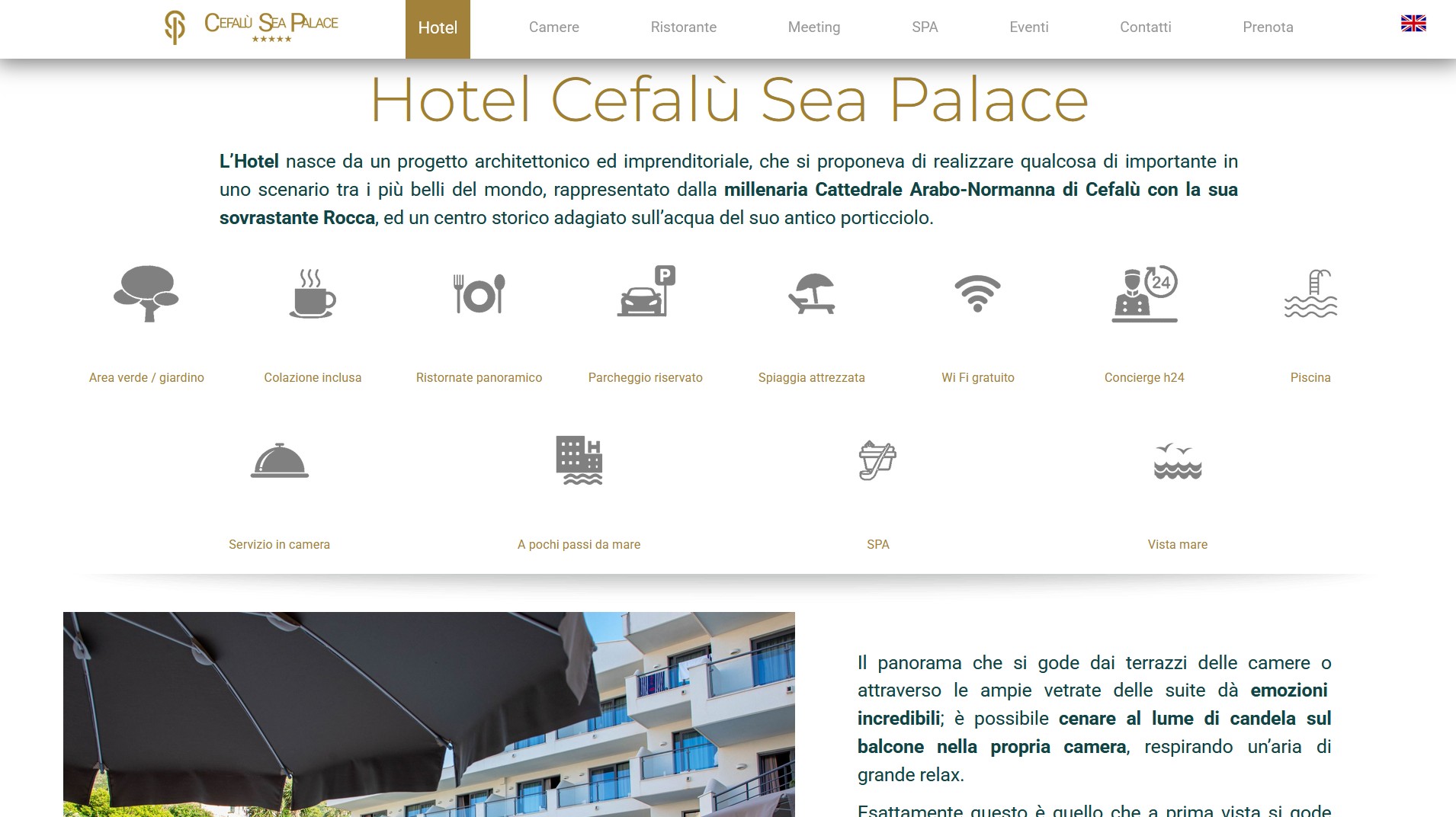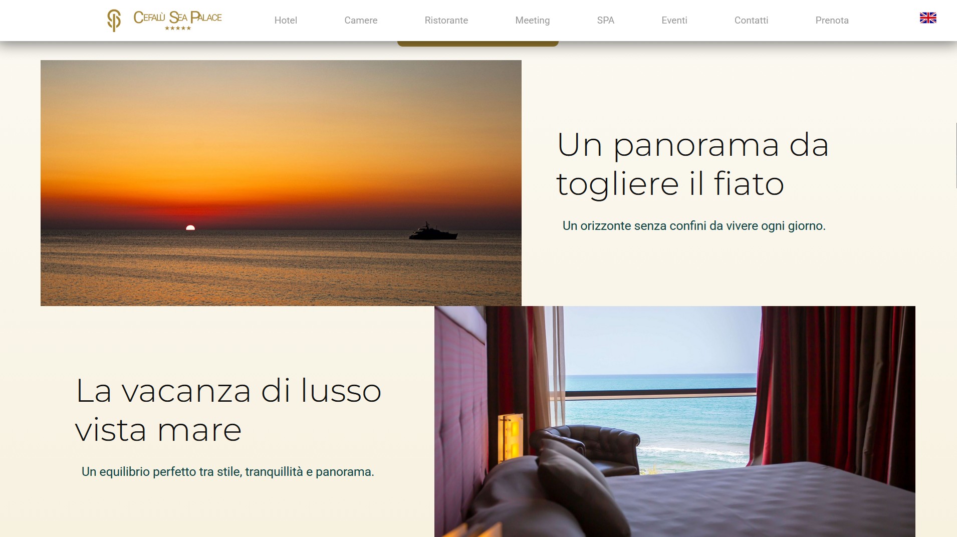 Il sito cefaluseapalace.it rappresenta perfettamente l’eleganza e la funzionalità di un hotel 5 stelle sul mare di Cefalù, con design moderno e intuitivo, immagini di alta qualità e sezioni chiare dedicate a camere, suite, ristorante panoramico, spa, spiaggia privata e sale meeting fino a 280 posti. L’esperienza utente è fluida grazie al booking online, multilinguismo e contatti immediati, mentre i contenuti trasmettono lusso e comfort, valorizzando i servizi premium e la posizione esclusiva. Un progetto che unisce estetica, usabilità e strategia digitale, che punta alla qualità e alla comunicazione efficace.